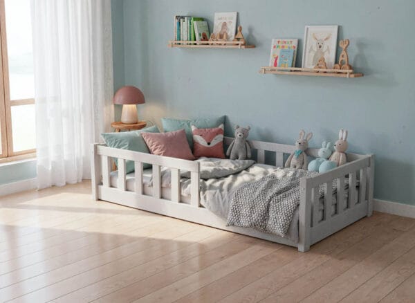 Łóżko dziecięce LULLU na niskich nóżkach to minimalistyczny, bezpieczny i estetyczny wybór dla rodziców, którzy szukają prostoty i naturalnych materiałów. Niewielka wysokość (1 cm) sprawia, że łóżko stoi bardzo nisko przy podłodze – idealnie sprawdza się w przypadku najmłodszych dzieci oraz w pokojach urządzonych zgodnie z filozofią Montessori.